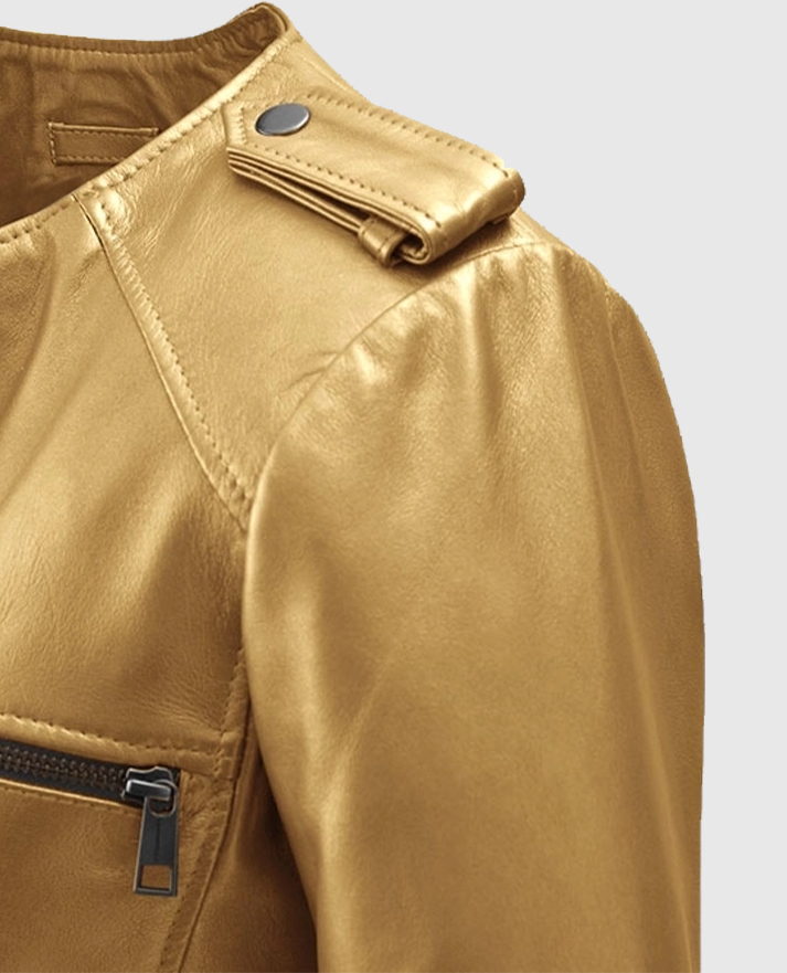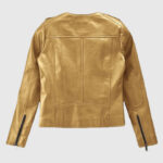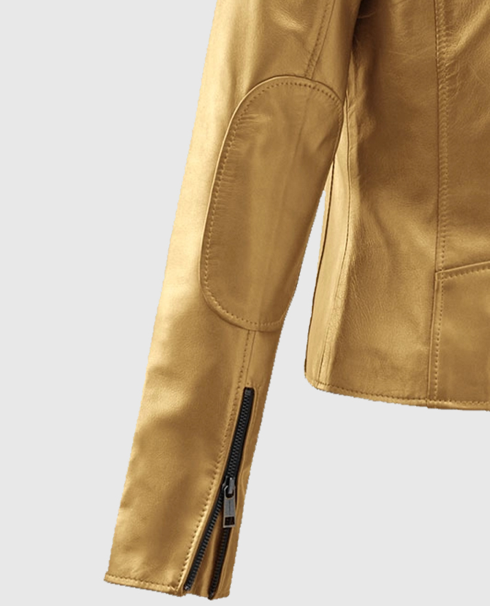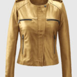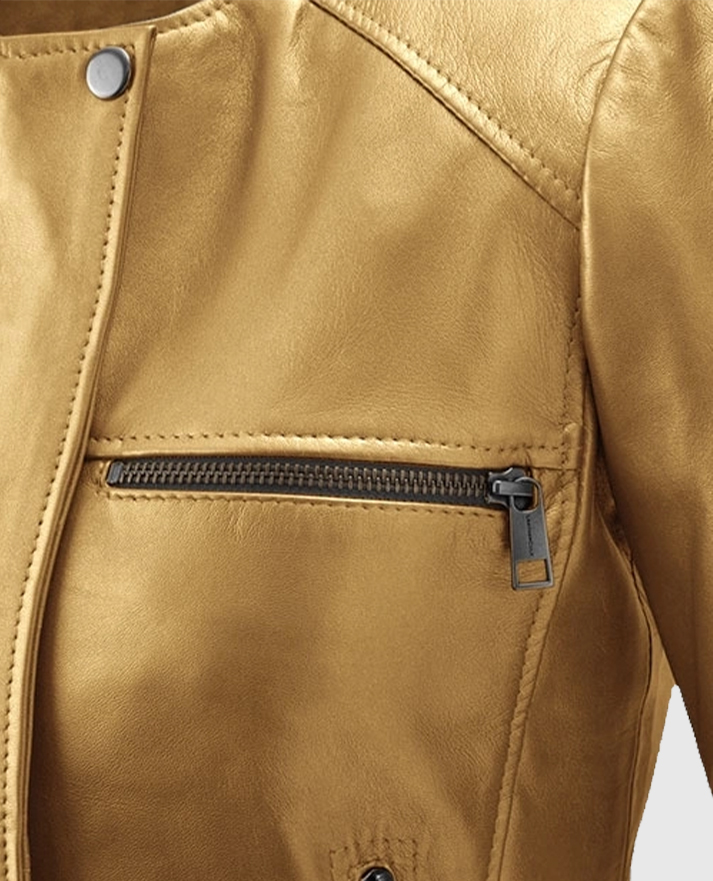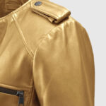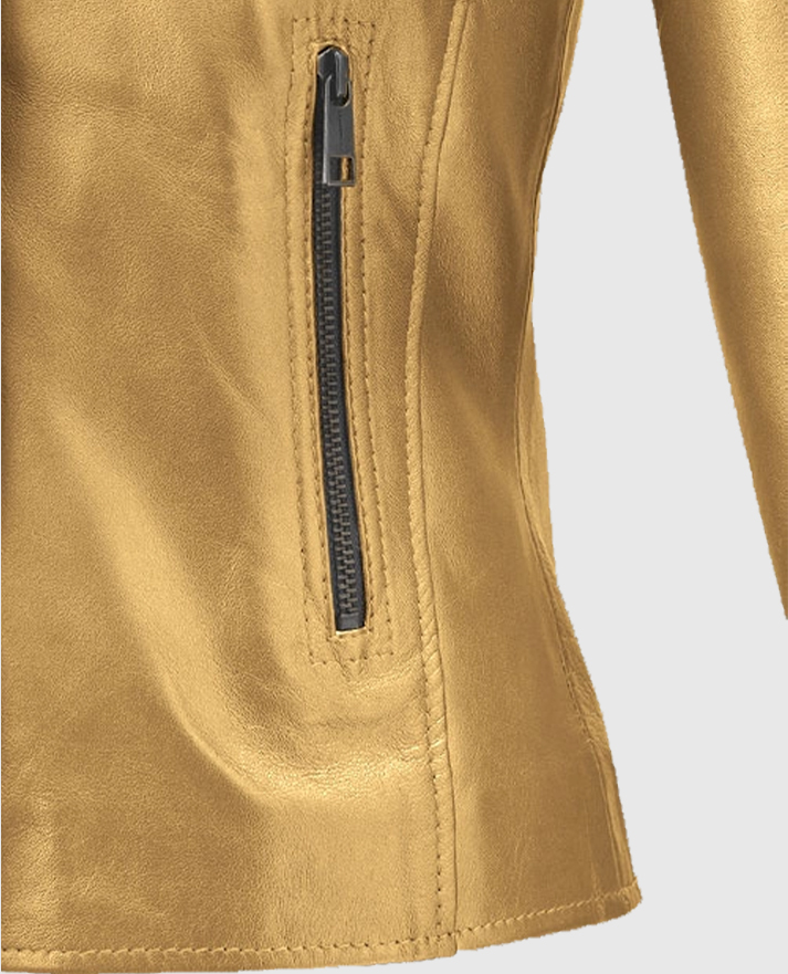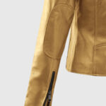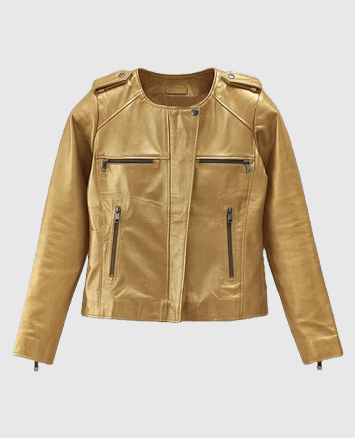 Add a touch of cinematic flair to your wardrobe with the Women’s Lizzy Caplan Golden Casual Leather Jacket, inspired by her bold appearance in Now You See Me 2 as Lula. Crafted from premium sheepskin leather and finished in a striking golden hue, this jacket instantly elevates any outfit. The design features a sleek zipper closure paired with a snap-button collar, full-length sleeves, and zipper cuffs for an edgy finish. With four functional zipper pockets at the chest and waist, it balances practicality with modern style.