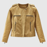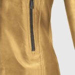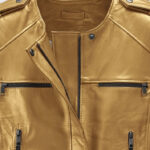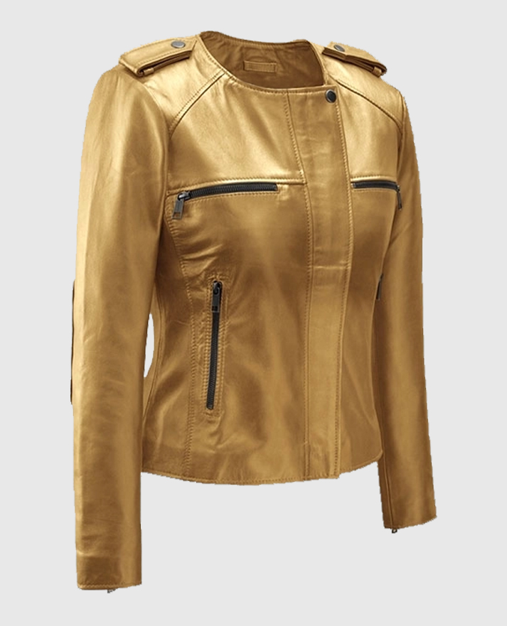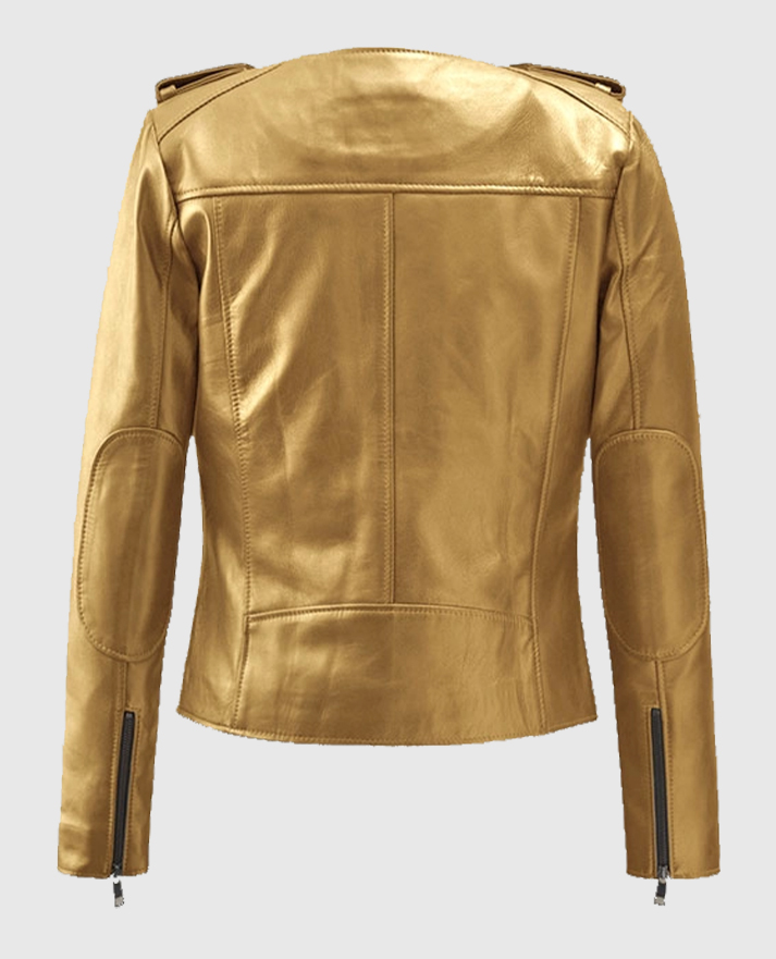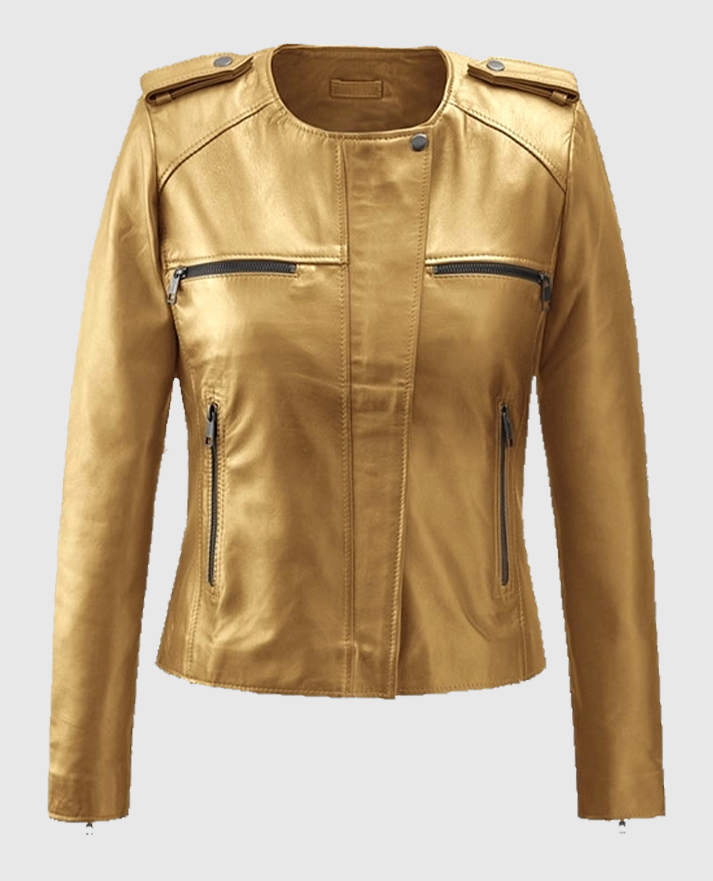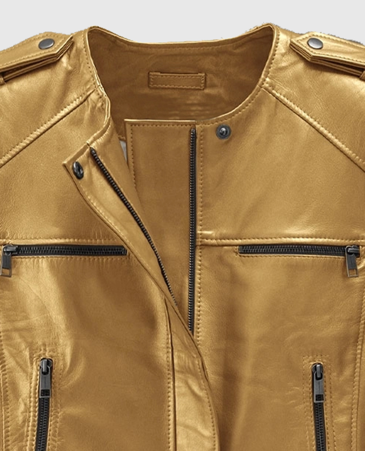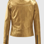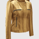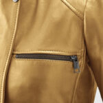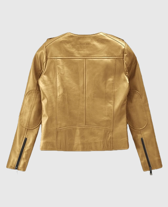 Add a touch of cinematic flair to your wardrobe with the Women’s Lizzy Caplan Golden Casual Leather Jacket, inspired by her bold appearance in Now You See Me 2 as Lula. Crafted from premium sheepskin leather and finished in a striking golden hue, this jacket instantly elevates any outfit. The design features a sleek zipper closure paired with a snap-button collar, full-length sleeves, and zipper cuffs for an edgy finish. With four functional zipper pockets at the chest and waist, it balances practicality with modern style.